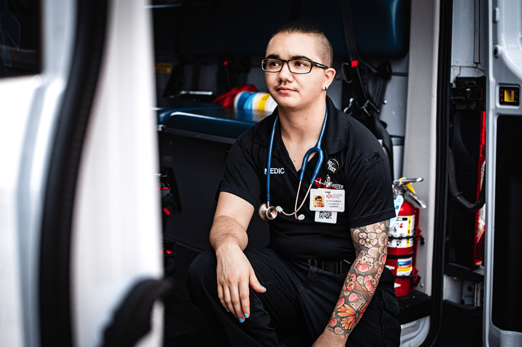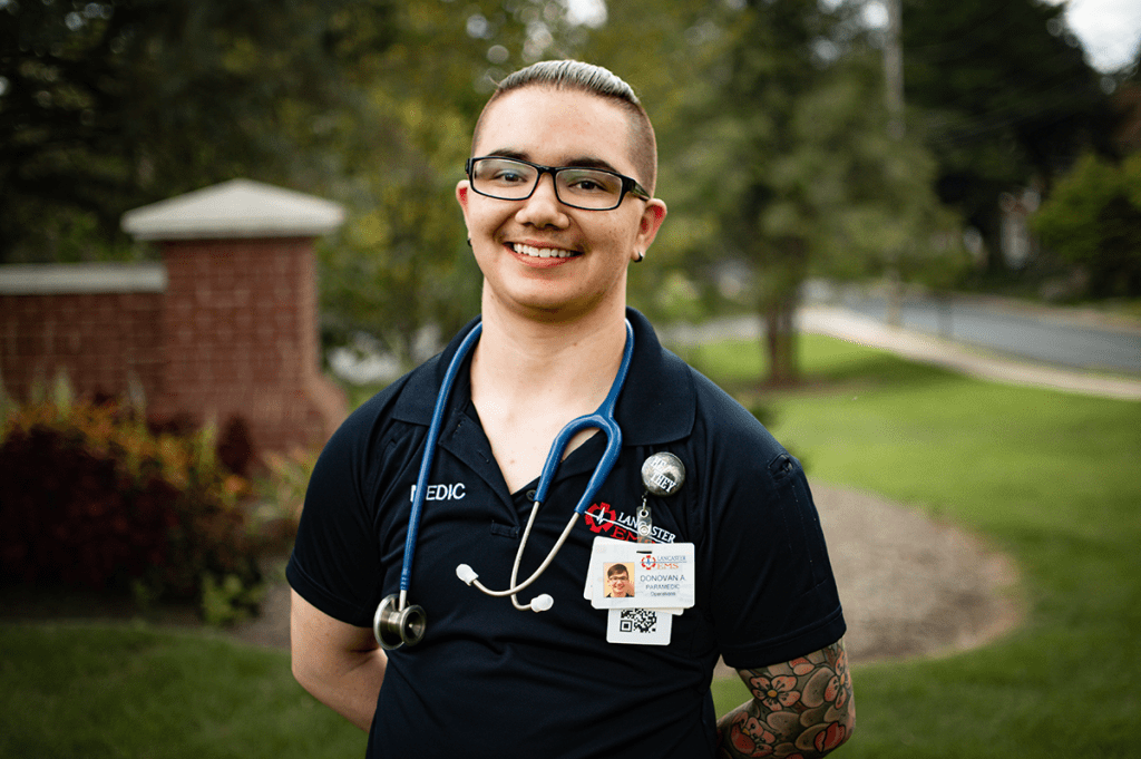 Nearing 21, Donovan would soon move out of their parents’ house and leave the church behind, along with most of their family and friends; and two years after starting at Lancaster EMS, they would begin pursuing their childhood dream of becoming a paramedic. Like many fellow First Responders, Donovan’s passion was born out of a desire to help others–but he also had a deep admiration for health science, “I find anything related to medicine and the human body fascinating. Just how the human body integrates all its systems and has to work together–no body system can operate on its own.”