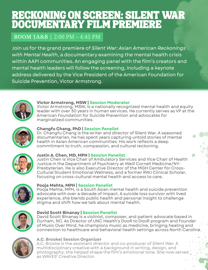 Headed off to North Carolina tomorrow for UCA WAVES’ conference, Roots & Resilience: The Power of Data & Stories to Advance AAPI Youth Mental Health. This event has been months in the making, and brings together talented, passionate people from across the country. There, we’ll also be officially premiering Silent War: Asian American Reckonings with Mental Health for the world to see!