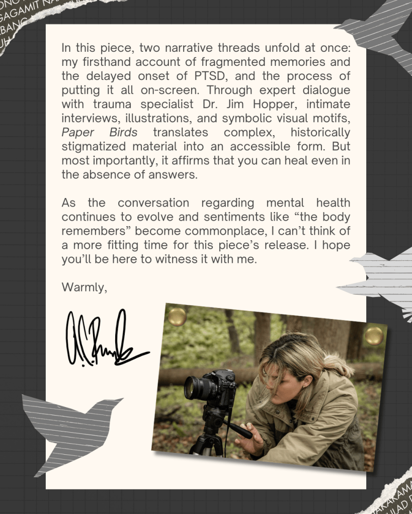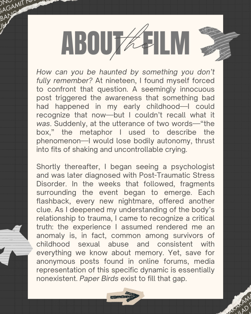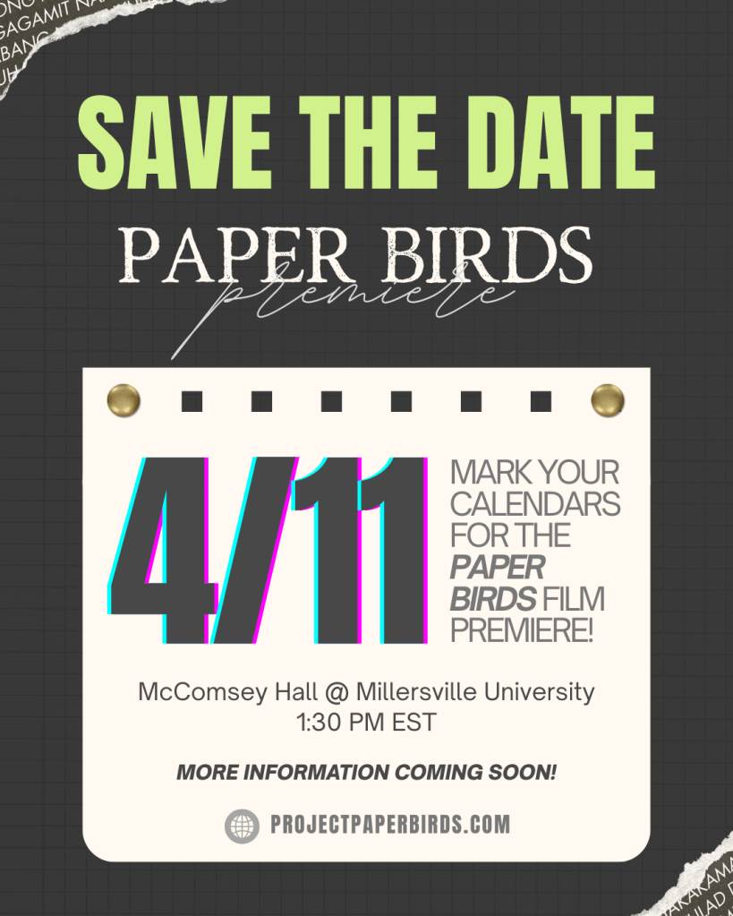 Excited to share that my documentary, Paper Birds, will be premiering at Millersville University next month! I’ll have more information to share soon, but in the meantime, wanted to put this “save the date” flier out there. Also planning on holding a post-screening panel/Q&A, as well as inviting relevant organizations and groups to table at the event. This is free and open to the public. Please feel free to share with family and friends. Hope to see some familiar faces there! 🙂